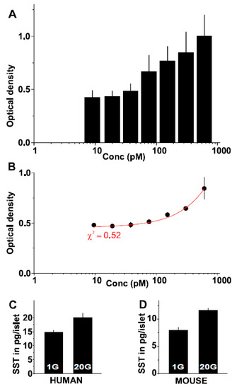 SST plasma levels are altered in the presence of anti-diabetic drugs [15]. Previous assays fail to measure changing concentrations of SST from isolated islets. We believed that this was due to the concentration of SST per islet that can vary between 3–25 pg. Therefore, we successfully exploited antibody SST10G5 to measure SST from mouse and human islets under low (1 mM) and high (20 mM) glucose concentrations. We observed significant changes in SST secreted under these glucose concentrations (Figure 6C,D). Furthermore, this has been the most consistent method of measuring SST secreted from the islets without using radioactive isotopes. Due to high radioactivity risks posed by using radioactive isotopes [17], we believe that the assay proposed will be of huge importance to researchers studying the secretion of islet hormones such as SST in the future.