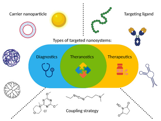 As GRPR is well acknowledged to be overexpressed in cancers, it attracts the attention of scientists dealing with novel delivery systems based on active targeting, where GRPR ligands are used as moieties able to lead to preferential accumulation of the nanoparticles in the sites of interest. These nanoparticles may act as drug delivery vehicles, so they deliver cytotoxic biological activity in the tumor site. On the other hand, detectable nanoparticles can be tracked in the human body using different imaging modalities, hence helping with cancer localization and staging. Finally, both these activities can be incorporated into one construct and act as theranostic, the idea derived from the personalized medicine approach, which connects oncological diagnostics and treatment at the same time. During the design of a targeted nanoformulation, fundamentally, three vital points need to be initially considered: the choice of the proper targeting ligand, the type of nanoparticles, and the means of bringing those together (Figure 3). These three aspects need to be fine-tuned to allow the successful development of nanosystems with anticipated properties and activity, particularly with respect to the desired mode of operation: therapeutic, diagnostic, or, combining both, theranostic (Figure 3).