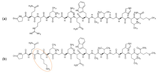 Structures of commercially available bombesin peptides: (a) BBN (Pyr-Gln-Arg-Leu-Gly-Asn-Gln-Trp-Ala-Val-Gly-His-Leu-Met-NH2); (b) [Lys3]BBN (Pyr-Gln-Lys-Leu-Gly-Asn-Gln-Trp-Ala-Val-Gly-His-Leu-Met-NH2). Lysine included in the modified BBN sequence is labeled orange. Sketched with MarvinSketch 22.13 (ChemAxon Ltd., Budapest, Hungary).