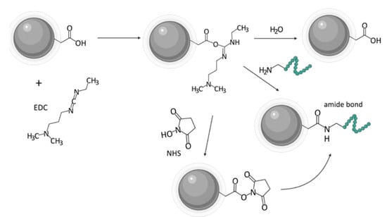 One of the biggest challenges in the synthesis of particles targeting GRPR or any other receptor is the incorporation of the targeting ligand in the structure of the vehicle. Various approaches can be found in the literature. A state-of-the-art technique based on the formation of an amide linkage between the ligand and the nanoparticle is most commonly used. Chemistry of 1-ethyl-3-(3-dimethyl aminopropyl)carbodiimide (EDC, EDAC) in combination with N-hydroxysuccinimide (NHS) [24] or sulfo-N-hydroxysuccinimide (sulfo-NHS) [43,48] is most commonly used to create the bond. Usually, this amide is formed between the N-terminus of the peptide ligands and carboxyls on the nanoparticles (Figure 5). Tang and co-workers successfully decorated their poly(acrylic acid)-functionalized lanthanide nanoparticles with BBN analog using EDC/sulfo-NHS chemistry [49]. It was even shown to be feasible to prepare ready-to-use kits with, e.g., stable NHS esters. EDC/NHS reactions are usually led in water, which is beneficial in terms of biocompatibility and purification procedures. However, the reaction, for instance, in tetrahydrofuran (THF) or dimethylformamide (DMF) is also possible, as shown by Du and Li [21] and Mansour et al. [50], respectively.