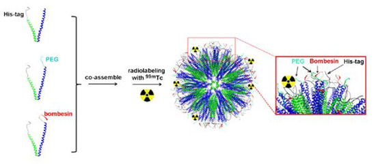In some cases, the ligand can be incorporated into the structure of particle-forming substrates before the particle is formed [63]. Accardo et al. have used solid-phase peptide synthesis with Fmoc/tBu chemistry to synthesize the ligand peptide [DOTA-bAla]BBN(7–14) and combine it with the amphiphilic monomers [64]. Subsequently, these monomers were cleaved from the Rink amide resin, purified, and assembled into targeted supramolecular aggregates. A similar approach was adopted by Accardo and co-workers to prepare DOX-loaded targeted liposomes [37]. Kanazawa et al. used this approach to combine bombesin with stearic acid directly in solid-phase peptide synthesis, and they used it for polymeric micelles [65]. Yang and co-workers incorporated the GRPR binding motif of BBN into the structure of their engineered peptides able to form a stable coiled-coil nanostructure [66]. An interesting approach was also presented by Zhang and colleagues—they have genetically engineered Escherichia coli bacteria to express elastin-like peptides capable of coassembly into micelles [67]. One of the peptides was engineered to contain a GRP-derived binding sequence (Figure 6).