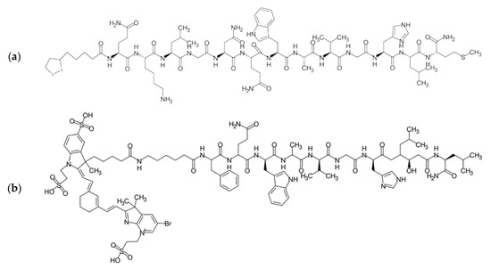 Structures of bombesin derivatives: (a) modified with thioctic acid for binding with gold nanoparticles [72]; (b) AF750-6Ahx-Sta-BBN for biding with nanographene oxide via hydrogen and π–π interactions [40]. Sketched with MarvinSketch 22.13 (ChemAxon Ltd., Budapest, Hungary).