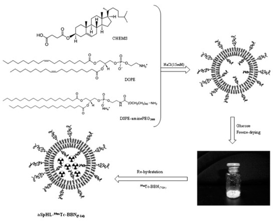 Technetium-99m labeled BBN(7–14) ligand can be incorporated in the liposome by encapsulating it inside the vesicle. CHEMS—cholesteryl hemisuccinate; DOPE—dioleoylphosphatidylethanolamine. Reprinted with permission from ref. [75]. Copyright 2022, Elsevier.