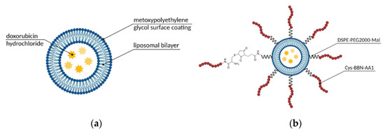 Structures of (a) Doxil (PEGylated liposomal doxorubicin) (inspired by ref. [83]) and (b) Doxil conjugated with BBN employing DSPE-PEG2000-maleimide (inspired by ref. [39]). Created with BioRender.com.