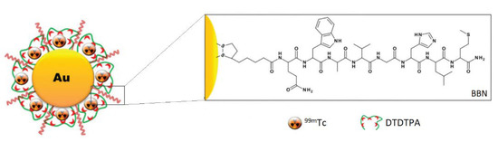 Structure of 99mTc-labeled gold nanoparticles conjugated with BBN and DTDTPA. Adapted with permission from ref. [27]. Copyright 2022, Royal Society of Chemistry.