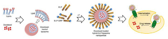 Subsequently, Zhang and colleagues took their ELP nanostructures to the next level and constructed innovative hybrid ELP/liposomal nanocarriers, combining the liposomal formulation’s advantages with the ELP-GRP targeting potential to form a docetaxel delivery vehicle with high specific binding and improved cytotoxicity [79]. As a result, 40–200 nm monodisperse nanoparticles with neutral zeta potential showed high entrapment of DTX and GRP motif on the surface and enhanced specific binding of their hybrid carriers to prostate cancer cells, but not to GRPR-free cells (Figure 12). Moreover, targeting improved the cytotoxicity of the DTX-loaded nanostructures.