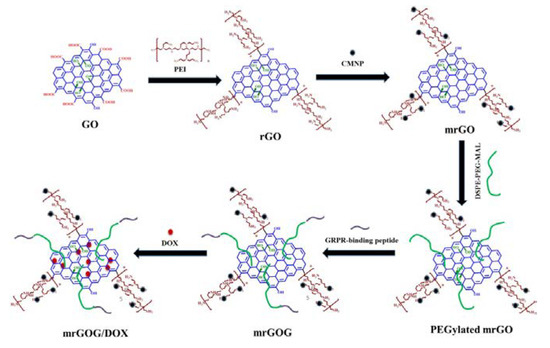 The process of preparing BBN-conjugated, DOX-loaded magnetic reduced graphene oxide NPs (mrGOG/DOX). Reprinted with permission from ref. [62]. Copyright 2022, Elsevier.
