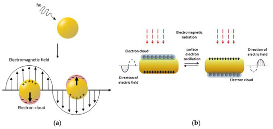 Schematic representation of the surface plasmon resonance (SPR) effect in (a) gold nanoparticles (adapted from ref. [99]) (b) gold nanorods (adapted with permission from ref. [85]. Copyright 2022, Elsevier).