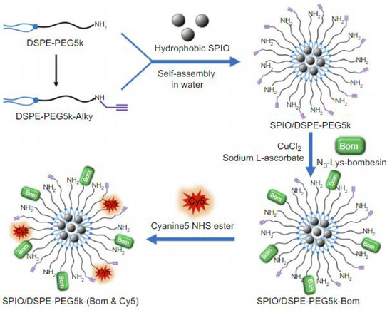 - Li, L.; Wu, C.; Pan, L.; Li, X.; Kuang, A.; Cai, H.; Tian, R. Bombesin-functionalized superparamagnetic iron oxide nanoparticles for dual-modality MR/NIRFI in mouse models of breast cancer. Int. J. Nanomed. 2019, 14, 6721–6732. [Google Scholar] [CrossRef]