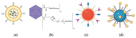 The wide range of agonistic ligands has been shown in the literature. The relatively easiest approach is to use the commercially available native sequence of bombesin [16] (Figure 4a). Kulhari and co-workers exploited it in combination with biodegradable poly(lactic-co-glycolic acid) (PLGA) nanoparticles to successfully target both breast and prostate cancer cells and improve docetaxel (DTX) anticancer activity [17,18,19]. The same ligand was also used to target the [64Cu]CuS nanoparticles toward prostate cancer by Cai et al. [20]. Interestingly, using native bombesin, Du, and Li investigated if the synthetic strategy, namely pre/post-functionalization of nanostructured lipid carriers, affects the performance of the nanosystem for targeted lung cancer combination therapy [21].