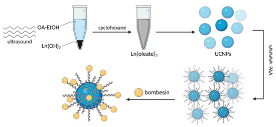 Among biomaterials studied, poly(lactic-co-glycolic) acid nanoparticles seem to be of the greatest interest for the preparation of nanoparticles (NPs) for therapeutics. Kulhari et al. synthesized biodegradable PLGA carriers by a nano-precipitation method and successfully grafted them with BBN through amide bonding (Figure 11) [17]. The PLGA–BBN conjugate exhibited improved stability and aggregation resistance in relation to pure PLGA nanoparticles. Furthermore, the construct durability was examined through BBN release studies and revealed a slow peptide discharge of 6.8% within 1 h (under acceleration conditions), followed by around 12.8% being lost within 24 h, suggesting a satisfactory level of stabilization through covalent bonding. The research continued with experiments on DTX-loaded, BBN-conjugated PLGA particles prepared by the same method, with sodium cholate as the surfactant and BBN conjugated to the surface of already-loaded particles [18]. Formulation allowed for a steady drug release over the period of 120 h, in contrast to pure drug suspension or Taxotere®, which showed burst release of the drug within 10 h. Simultaneously, as in the case of most drug-loaded formulations, the initial 24 h was when the greatest amount (~21%) of DTX was released.