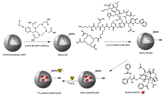 - Gibbens-Bandala, B.; Morales-Avila, E.; Ferro-Flores, G.; Santos-Cuevas, C.; Luna-Gutiérrez, M.; Ramírez-Nava, G.; Ocampo-García, B. Synthesis and evaluation of 177Lu-DOTA-DN(PTX)-BN for selective and concomitant radio and drug-therapeutic effect on breast cancer cells. Polymers 2019, 11, 1572. [Google Scholar] [CrossRef] [PubMed]