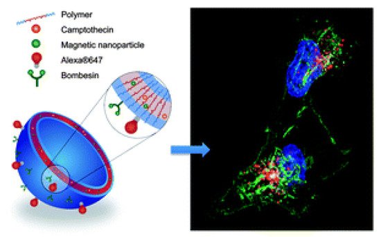 The use of other polymers, although widely studied for drug delivery, has not been examined to a great degree for GRPR targeting. This might be because liposomes and micelles based on polymers offer better properties for loading, conjugation, or drug release and can be used for numerous therapeutics regardless of their hydrophobicity/hydrophilicity. All the above-mentioned studies present some potential for improving tumor-specific drug delivery, but, unfortunately, none provided sufficiently satisfactory results. In Section 5.3, we showcase other interesting polymeric formulations with theranostic applications. The carrier’s architecture was designed to allow particle tracking using various diagnostic modalities and improve drug delivery into cancer cells.