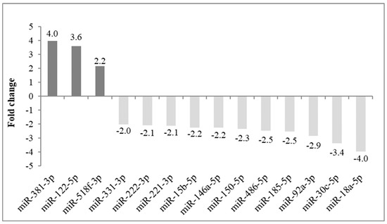 Pre- vs. post-LT serum miR profiling: up- and downregulated miRs. MiRs showing relevant (fold change ≥ 2) upregulation are displayed in dark grey (N = 3), while miRs with relevant downregulation (fold change ≤ −2) are displayed in light grey (N = 11) in three recipients analyzed before and after transplantation. Fold change values are reported for each miR.