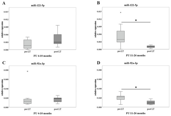 Validation analysis on pre- and post-LT samples. RT-qPCR results of miR-122-5p (panel (A,B)) and miR-92a-3p (panel (C,D)) are shown as box plots (with median) of the relative expression for each group. The analyses were performed comparing different FU periods (4–10 and 11–26 months) and assessing 7 patients for each group. Paired samples data were analyzed with Wilcoxon Mann-Whitney tests. * p ≤ 0.05.