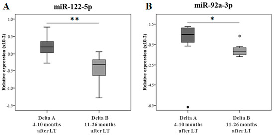Delta (pre- vs. pos-LT) analyses of the miR relative expression at different FU periods. In panel (A), the miR-122-5p delta of the relative expression; in panel (B), the miR-92a-3p delta of the relative expression at different FUs are shown. Delta A represents the changes in the miR relative expression between pre- and 4–10 months post-LT in the same subjects (N = 7). Delta B represents the changes in the miR relative expression between pre-LT and 11–26 months post-LT in the same subjects (N = 7). The data are reported as box plots (with median) and were analyzed using the Mann–Whitney nonparametric test. * p ≤ 0.05 and ** p ≤ 0.01.