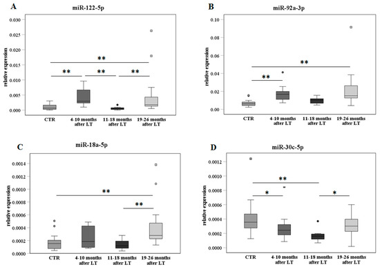 MiR expression analyses according to the FU and compared to the nontransplanted healthy control group. MiR-122-5p (panel (A)), miR-92a-3p (panel (B)), miR-18a-5p (panel (C)), and miR-30c-5p (panel (D)) are shown as box plots (with median) of the relative expression for each group along FU, i.e., 4–10 (N = 11), 11–18 (N = 8), and 19–26 months (N = 14). The data were also compared to the nontransplanted healthy control group (CTR, N = 24) and analyzed with the Kruskal–Wallis test. * p ≤ 0.05 and ** p ≤ 0.01.