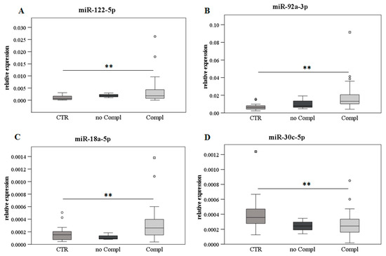 Levels of the selected miRs with or without LT complications. The data on the miR expression level in the presence (N = 30) or absence (N = 3) of complications after LT in comparison with the healthy control group (CTR, N = 24) are reported. MiR-122-5p (panel (A)), miR-92a-3p (panel (B)), miR-18a-5p (panel (C)), and miR-30c-5p (panel (D)) are shown as box plots (with median) of the relative expression for each group. The data were analyzed with the Kruskal–Wallis test. ** p ≤ 0.01.