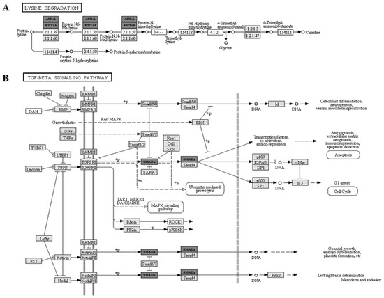The four pathways resulted in significance, but two out of the four were the most significant (p = 2.96 × 10−8), i.e., lysine degradation cascade and transforming growth factor-beta (TGF-β) signaling pathways. The former included two gene transcripts as common targets of all of the analyzed miRs, i.e., ASH1-like histone lysine methyltransferase (ASH1L) and lysine methyltransferase 2A (KMT2A). Their action points are present in one specific section of the lysine pathway, as presented in Figure 6A. The latter includes one common mRNA target of all the selected miRs, i.e., SMAD family member 2 (SMAD2). The TGF-β pathway and the sites of action of SMAD2 are reported in Figure 6B.