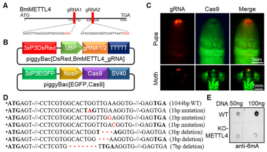 CRISPR-Cas9 system induced the mutation of BmMETTL4. (A) A schematic diagram of the BmMETTL4 gene structure and gRNA-target sites. (B) Plasmid construction for generation of the transgenic silkworm. (C) Positive transgenic silkworms co-expressing gRNAs and Cas9. The positive silkworm pupa and moth were screened under RFP fluorescence (red) and GFP fluorescence (green), respectively. Scale bar is 5 mm. (D) PCR-based amplification and sequencing of regions targeted by gRNAs in KO-METTL4 and WT silkworms. The nucleotides labeled in red were replacement, the dots in red were depleted nucleotides, and the bold nucleotides were stop codon. (E) Genomic DNAs isolated from the embryos of KO-METTL4 and WT silkworms were subjected to dot blot assays.