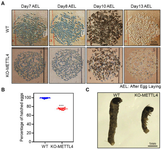 After the crossing of BmMETTL4 mutant strains, it was observed that eggs laid from KO-METTL4 strain were frequently interrupted at the last stage of embryonic development that cannot be hatched normally. To examine the detailed changes of embryos, we traced the developmental process of eggs during the last few days. The embryos in the eggs from KO-METTL4 could normally proceed to the stage of serosa and abdominal pigmentation in which almost all the silkworm eggs have turned colors and reached the stage close to hatching on day 8 after oviposition (Figure 2A). However, as all WT silkworms were hatched on day 10 after oviposition, only a small number of embryos of KO-METTL4 could develop into larvae and the remaining embryos in the eggs did not further hatch even on day 13 after oviposition (Figure 2A). We analyzed the hatchability of WT and KO-METTL4, which showed that more than 25% of embryos from KO-METTL4 had died (Figure 2B). To understand the phenotypic consequence of these abnormal embryos, we dissected the unhatched embryos from eggs. It was clearly shown that the embryos of KO-METTL4 were much smaller than that of WT silkworms (Figure 2C). These results indicated that BmMETTL4 mutant affected the development of the late silkworm embryo and led to the failure of hatching.