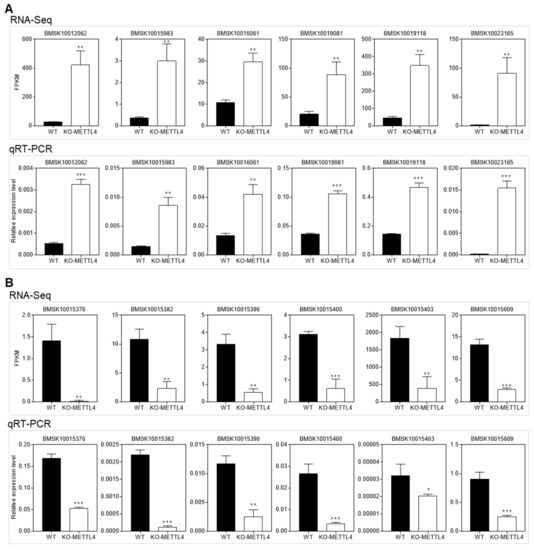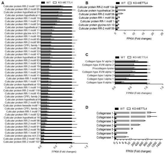 From the GO and KEGG analyses of DEGs, we found that the structural constituent of cuticle was significantly enriched in down-regulated DEGs. We therefore surveyed all the cuticular protein genes in DEGs between the KO-METTL4 mutant and WT. It was clearly shown that 46 cuticular protein genes were significantly down-regulated in KO-METTL4 (Figure 7A) and only 7 genes were up-regulated (Figure 7B). Moreover, these cuticular protein genes had covered almost all the cuticular protein families of RR-1, RR-2, Tweedle, CPFL, CPG, and CPH, with the exception of RR-3 [25]. Intriguingly, another group of molecular structure such as collagens were all down-regulated in mutation of BmMETTL4 (Figure 7C), whereas collagenase responsible for degrading native collagen were significantly up-regulated (Figure 7D) [26,27]. These analyses indicated important roles of structural proteins in the process of embryogenesis.