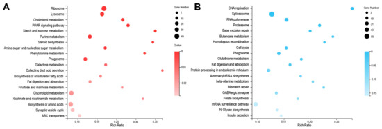 To further gain insight into the biological pathways after BmMETTL4 depletion, DEGs were mapped to the KEGG database and the top 20 enrichments of up-DEGs and down-DEGs were shown in Figure 6. The pathways of up-regulated DEGs in BmMETTL4 mutant were significantly enriched in collecting duct acid secretion, starch and sucrose metabolism, steroid biosynthesis, and phenylalanine metabolism (Figure 6A). For the down-regulated DEGs, the significantly enriched KEGG pathways were DNA replication, butanoate metabolism, homologous recombination, and mismatch repair (Figure 6B). The differential GO and KEGG between up-DEGs and down-DEGs indicated the crucial roles of BmMETTL4 during silkworm embryogenesis