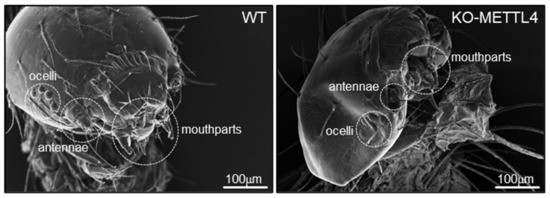 Due to the failure of hatching of BmMETTL4 mutant silkworm, we speculated that the large number of cuticular protein genes and collagens down-regulated by the depletion of BmMETTL4 may affect the formation of hard cuticle and normal morphology of silkworm embryo. To examine this possibility, we dissected the late embryos of silkworm from the KO-METTL4 and WT, and screened the heads under a SEM. As shown in Figure 8, we observed a morphological abnormality of the head in KO-METTL4 embryos and numerous defects in head shapes and structures, especially on the mouthparts, antennae, and ocelli that were seriously atrophied compared to the WT. These data suggested that the majority of down-regulated structural constituents in BmMETTL4 mutant probably resulted in developmental defects of silkworm embryo and thus affected the hatchability of silkworm.