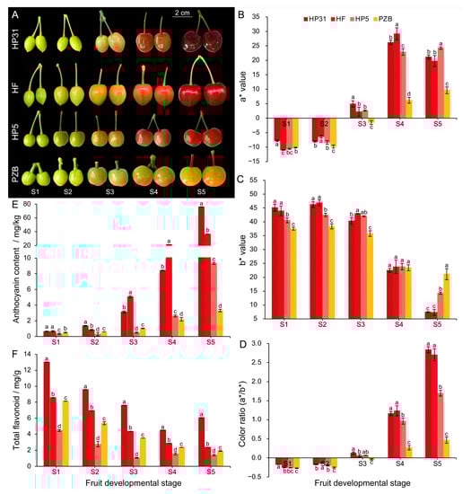 Color phenotypic characterization of Chinese cherry during fruit development. (A) Fruit phenotypes during development in dark-red and yellow fruits. (B) The a* values. (C) The b* values. (D) Color ratio (a*/b*). The a* coordinate represents the red (positive)-to-green (negative) scale, the b* coordinate represents the yellow (positive)-to-blue (negative) scale. Color ratio (a*/b*) represents the comprehensive color index []. (E) Total anthocyanin content. (F) Total flavonoids content. Error bars indicate ± standard deviation (SD) from three independent biological replicates. The lower case letters indicate significant difference at 0.05 level.