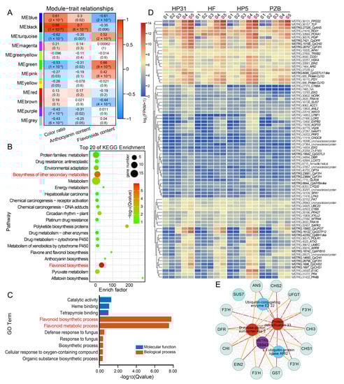 WGCNA was conducted using the WGCNA R package with default settings (v1.4.1717). All genes were imported into WGCNA to construct co-expression modules using the automatic network construction function block-wise Modules. Correlations between modules and color ratio, and anthocyanin and flavonoid content at each developmental stage were analyzed with respect to all genes in each module. Significant trait-related modules were identified based on high correlation values. Using default settings, genes from the MEblack module were exported for Cytoscape software (v.3.9.1) [].