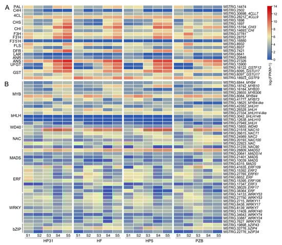 Expression heatmap of structural genes (A) and transcription factors (B) associated with anthocyanin biosynthesis. The heatmap represents the expression of corresponding genes in Chinese cherry fruits, and from blue to red in the heatmap indicates the expression levels of genes ranging from low to high. The color scale of the heatmap represents expression levels as log2(FPKM + 1).
