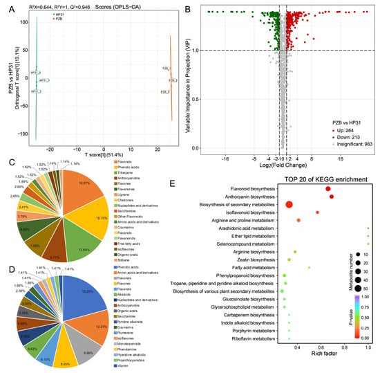 Overall analysis of the metabolomics data between dark-red and yellow fruits of Chinese cherry. (A) OPLS-DA. (B) Volcano plots of the metabolic profile in dark-red and yellow fruits. (C,D) Type and number of up-regulated and down-regulated metabolites. The TOP 19 types of DEMs were shown here. (E) TOP 20 of KEGG enrichment in the differential metabolites.