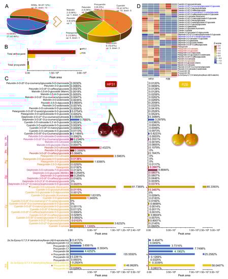 Comparison of anthocyanin and procyanidin compounds between dark-red and yellow fruits of Chinese cherry. (A) Type and number of differentially expressed metabolites. (B) The relative contents (peak area) of total anthocyanin and total procyanidin. (C) The relative contents and percentage of anthocyanin (upper) and procyanidin (lower) components in dark-red and yellow fruits of Chinese cherry. The blue font indicates the no-DEMs of procyanidins, and other colorful font indicates the 36 DEMs. Red asterisk indicates the predominant anthocyanin and procyanidin compounds. Abbreviations: Cy, cyanidin; Dp, delphinidin; Pg, pelargonidin; Pn, peonidin; Mv, malvidin; Pt, petunidin; PA, procyanidin. (D) Heatmap of the 36 DEMs. The color key from blue to red represents the relative content from −1.5 to 2.0. Red and blue font color indicates the top three up-regulated and down-regulated anthocyanins in the yellow vs. dark-red comparison.
