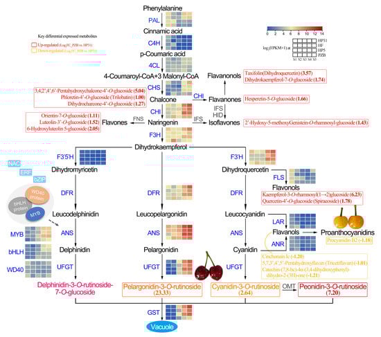 With the recent advancements in transcriptome and metabolome, the integrative analysis has provide an effective approach to illustrate the metabolic pathways and regulatory genes in fruit crops, such as sweet cherry [], tomentosa cherry [], strawberry [], and longan []. In this study, integrative analysis of transcriptome and metabolome data were conducted to (i) analyze the color differences between dark-red and yellow Chinese cherry fruits, (ii) identify the differential expressed genes associated with anthocyanin biosynthesis during fruit development, and (iii) identify the key differential expressed metabolites related to anthocyanins and proanthocyanidins between mature dark-red and yellow fruits. These results provide insights for the identification of metabolites and candidate genes involved in anthocyanin formation and color change between dark-red and yellow Chinese cherry fruits, which lays a molecular foundation for color improvement and breeding program in the future.