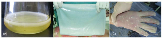 Medical and cosmetic applications of bacterial nanocellulose: (A) cellulose layer grown on the top of bacterial culture; (B) wound dressing prepared form purified cellulosic membrane; (C) application of cellulose hydrogel patch (clinical context) in a burn injury. Reprinted with permission from Ref. [3], 2016, Elsevier Ltd.