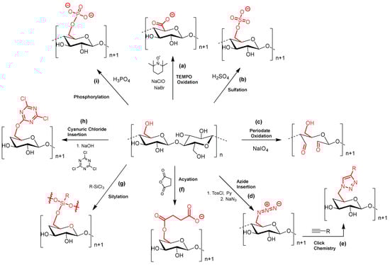 - Cumpstey, I. Chemical Modification of Polysaccharides. ISRN Org. Chem. 2013, 2013, 417672. [Google Scholar] [CrossRef]