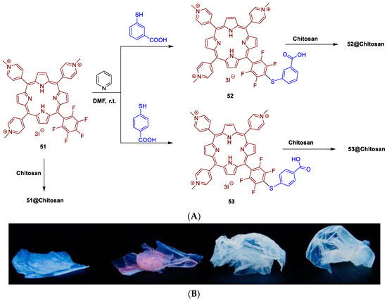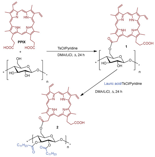In 2006, Krausz and co-workers [137] developed photobactericidal films 2 obtained by “one-pot, two-steps” esterification of cellulose with PPIX and lauric acid (Figure 4). The first step comprises the esterification of cellulose with PPIX using tosyl chloride (TsCl) plus pyridine to activate the primary hydroxyl groups, followed by a second step, under similar conditions, concerning the esterification of the remaining OH groups present on the cellulose-appended PPIX with the lauric acid.