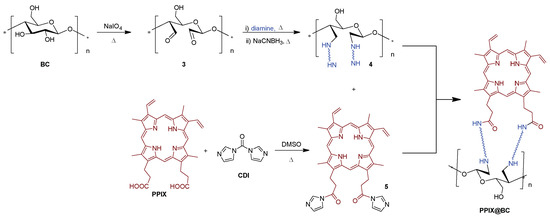 Oxidation of BC was mediated by sodium periodate (NaIO4) in an aqueous solution and then treated with 1,2-ethanediol overnight to remove the excess of periodate, giving material 3 (Figure 5). The incorporation of amines on 3 was carried out by the “one pot, two steps” method, consisting of the cellulose membrane immersion in a solution of the respective diamine (ethylenediamine, 1,2-bis(2-aminoethoxy)ethane and 1,4-bis(3-aminopropoxy)butane) for 12 h, followed by the addition of the reducing agent sodium cyanoborohydride. The reaction continued for additional 24 h. Finally, after washing steps, the material functionalized with NH2 groups 4 was coupled with the PPIX derivative 5 previously activated with carbonyldiimidazole (CDI), (Figure 5) giving the photoactive material PPIX@BC. After 24 h, the remaining free PPIX was thoroughly washed, and the resulting membrane dried under vacuum.