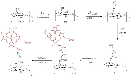 The promising results of aPDT accomplished by Wei and co-authors motivated the same authors to extend the strategy to the preparation of an improved photoactive material [139] with enhanced mechanical properties, high efficacy under low light conditions, and robustness towards photobleaching and reusability. The synthetic route employed was slightly different from the previous one: cellulose acetate (CelAc) was electrospun to produce nanofibers, thermally treated to enhance mechanical strength, and finally hydrolyzed to produce regenerated cellulose (RC) nanofibers that possessed a high surface area and nanofibrous structure. Covalent grafting of the activated PPIX 5 on epichlorohydrin/triethylenetetramine (TETA) functionalized cellulose 6, followed by zinc(II) complexation of porphyrinic macrocycle, afforded material 7 with a loading of 412 nmol Zn(II)PPIX/mg material (Figure 6). Antibacterial efficacy was evaluated against S. aureus (ATCC 6538) and E. coli (ATCC 8099), with results achieving detection limit inactivation (99.999%, >5 log of reduction) for both bacteria after 20 min of white light illumination (Xe lamp, 500 W, λ > 420 nm, 10 cm distance between lamp and sample). No statistically significant loss in antibacterial activity was observed when using nanofibers that had been photo-aged with 5 h of pre-illumination to simulate the effects of photobleaching. Taken together, the results suggest that such systems may employ cost-effective neutral PS paired with a wide range of polymeric scaffolds for the development of robust and durable self-sterilizing materials based on a photodynamic mode of action.