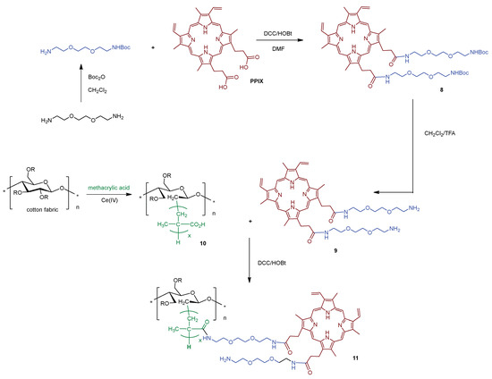 In 2018, Sol research group [140] developed a new antimicrobial material consisting of PPIX amino derivative, 9 bearing aminoethyleneglycol spacer arms immobilized in cotton/polymethacrylic support 10 (Figure 7). The authors polymerized methacrylic acid on cotton material, mediated by Ce(IV) as a redox radical polymerization system, affording the support 10. Aminoethyleneglycol spacer arms were appended on PPIX to facilitate its grafting to the carboxylic acid groups present at the polymethacrylic acid polymerized /cotton fabric. The first step involved the functionalization of PPIX with 1,2-bis(2-aminoethoxy)ethane monoprotected with tert-butyloxycarbonyl (Boc) in the presence of dicyclohexylcarbodiimide (DCC)/1-hydroxybenzotriazole (HOBt) giving 8. After acid deprotection of the amino groups, the desired PPIX amino derivative 9, obtained in quantitative yield, was successfully attached to 10 using classical peptide linkage conditions, yielding the material 11 (Figure 7). The photodynamic activity of photoactive cotton was evaluated against S. aureus and E. coli. Experimental data show that this cotton textile 11 bearing the PPIX derivative exerts only a photo-antibacterial effect against S. aureus, with inactivation of 99.9% (3 log reduction in CFU mL−1) after 24 h of white light irradiation (total light dose 9.5 J cm−2). Concerning Gram-(−) bacterium E. coli, the photosensitizing material did not show any photoactivity.