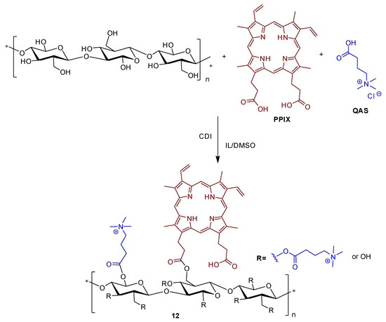 Strategy for preparation of water-soluble hybrid photoactive material 12 containing PPIX and QAS groups onto a cellulose support (adapted from Ref. [69]).