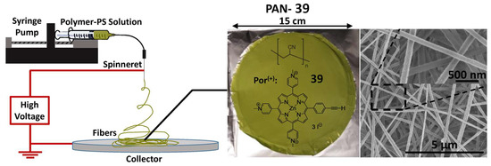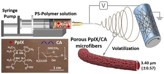 Scheme for the preparation of the porous PPIX-cellulose diacetate (PPIX@CA) membrane by electrospinning. Reprinted with permission from Ref. [141]. 2021, Elsevier.