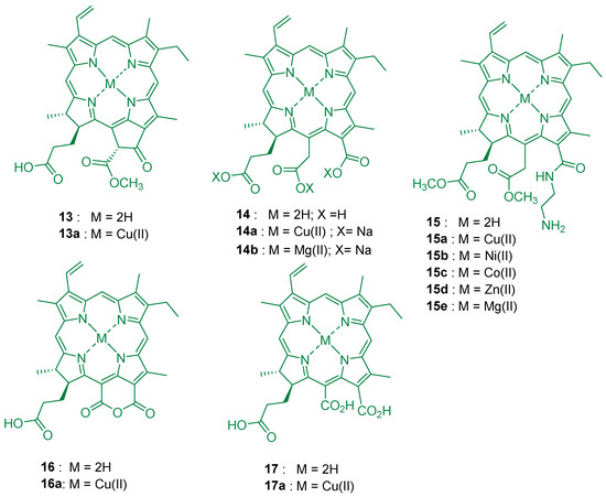 Later on, Gavara and coworkers [90] reported the possibility of utilizing copper(II) and magnesium(II) metal complexes of chlorin e6 (14a, 14b in Figure 11) incorporated in (hydroxypropyl)methyl cellulose (HPMC) for applications as photoactive coatings in polyethylene terephthalate (PET) packages. The antimicrobial properties of 14a and 14b in HPMC as coatings in PET packages were analyzed against Listeria monocytogenes and E. coli. The antimicrobial results indicated that 14b [M = Mg(II)] was more active than 14a [M = Cu(II)]) and that it was more effective against Gram-(+) bacterium L. monocytogenes (7 log reduction) than against E. coli where no significant growth reduction was observed.