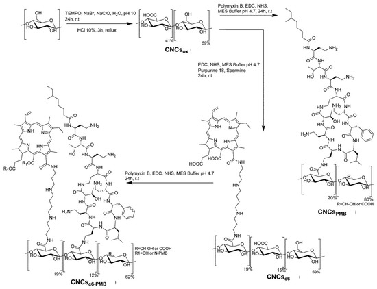 Synthetic route to cellulose nanocrystals CNCsc6-PMB coated with chlorin-e6 and polymyxin B and to cellulose nanocrystals CNCsPMB just coated with polymyxin B. Reprinted with permission from Ref. [67]. 2017, The Royal Society of Chemistry.