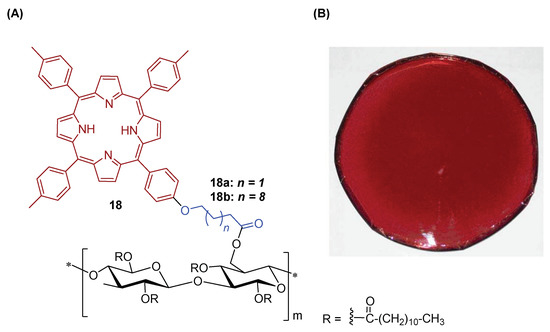 (A) Structure of tri-tolyl porphyrin derivative immobilized in ester laureate cellulosic polymer hybrid material (18a and 18b) prepared by Krausz and co-workers (adapted from reference [156]). (B) Porphyrinic cellulose laurate ester plastic. Reprinted with permission from Ref. [156]. 2008, Elsevier.