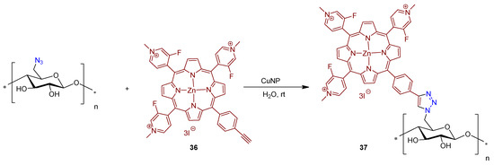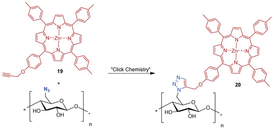 Later on, Krausz, Sol and co-workers [157] explored the “Click-Chemistry” synthetic approach to immobilize the Zn(II) complex 19 bearing a propynyloxy substituent on a cellulose cotton fabric functionalized with azide units (Figure 15). The new photoactive material 20 was characterized by ATR-FTIR and the antibacterial properties were evaluated. The authors showed for the fabric a similar antibacterial activity upon visible light irradiation against E. coli and S. aureus (reductions of ~5 log units).
