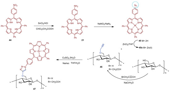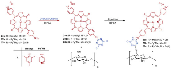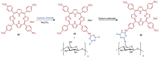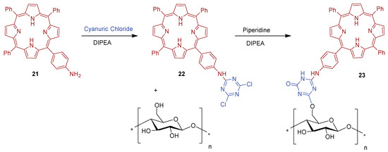 Based on the versatility, reactivity, and availability for stepwise substitution of chlorine atoms by different nucleophiles, Sol and collaborators [158] used cyanuric chloride (2,4,6-trichloro-1,3,5-triazine), as a grafting agent between porphyrins and cellulose fabrics. The unsymmetric 5-(4-aminophenyl)-10,15,20-triphenylporphyrin derivative 21 was linked to triazine in the presence of a base, N,N-diisopropylethylamine (DIPEA) at 0 °C (Figure 16). Then, porphyrin-triazine 22 was grafted onto cellulose square fabrics, in this case using DIPEA plus piperidine, and was tested in vitro against S. aureus.
