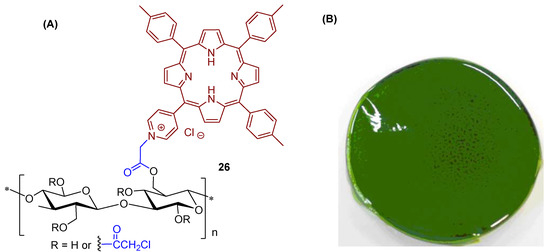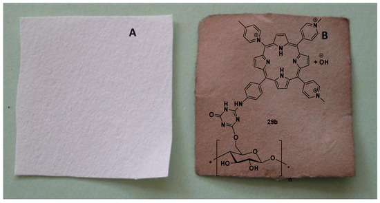 In the last few years, the development and biological assessment of new photosensitizers (PS) for antimicrobial photodynamic therapy (aPDT) were accompanied by their immobilization in different supports considering applications, such as wound disinfection and healing, sterilization of medical devices and surfaces in different contexts (industrial, household and hospital), or the prevention of microbial contamination in packaged food [42,43,55,56,57,58,59,60,61,62,63]. Photosensitizers for aPDT can become more efficacious when adsorbed, entrapped, or linked to cellulose-like supports [64,65,66,67,68,69]. In addition, these cellulose-based systems provide an increase in the surface area, and to improve the targeted drug delivery [70,71], can be used to develop packaging materials with better mechanical strength, barrier, and antimicrobial properties [72,73].