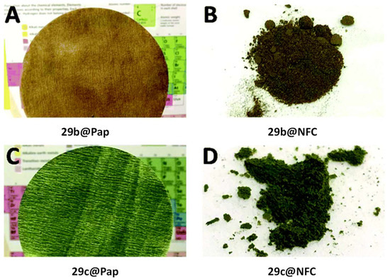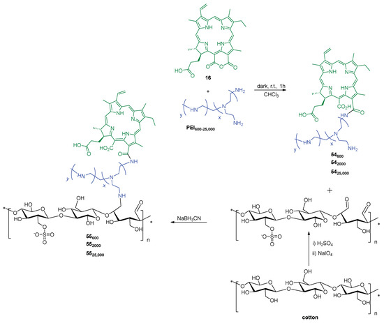Naturally occurring chlorophylls and bacteriochlorophylls are essential constituents of plants and bacteria, often called the “pigments of life” [134,135] owing to their important role in photosynthetic processes. Nowadays, their synthetic counterparts also present multiple applications essentially due to their absorbance of light in a broad range of the spectrum, particularly in the red (chlorins) and near infra-red region, NIR (bacteriochlorins) [65,143,144,145,146]. Intense red and NIR photons absorption is a desirable feature for biomedical applications (Imaging, PDT, aPDT), since the phototherapeutic window (650–900 nm) for electromagnetic radiation is the most penetrating and least harmful to human tissues [147,148]. Despite the interesting biological applications of natural semi-synthetic or synthetic hydroporphyrins, they are not naturally water-soluble and may aggregate in aqueous media [149,150]. Thus, several studies have been carried out to improve water solubility or dispersibility of hydroporphyrins and cellulose or cellulose-like supports have been employed as suitable carrier systems.