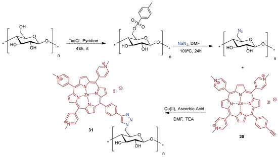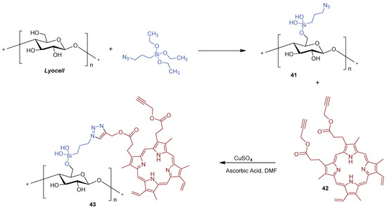 Cu(I)-catalyzed Huisgen 1,3-dipolar cycloaddition (Click-Chemistry reaction) was also considered an attractive approach to covalently conjugate functional molecules onto the cellulose surface. In this click reaction, the coupling of an azide moiety, previously introduced (Figure 3, path d) with a terminal alkyne, leads to the formation of a stable 1,2,3-triazole ring (Figure 3, path e) [128,129]. In this approach, cellulose primary hydroxyl groups are first converted into tosylate (-OTs) leaving groups, followed by their nucleophilic substitution with sodium azide (NaN3) in dimethylformamide (DMF), affording cellulose displaying azide functionalities (Figure 3, path d). A click reaction involving a molecule bearing a propargylic unit can then produce cellulose bearing triazole moieties (Figure 3, path e). However, this strategy can proceed in a different way i.e., the cellulose support can be first functionalized with the alkynyl unit via propargyl bromide and then the molecule to be appended can contain the azide functionality [130].